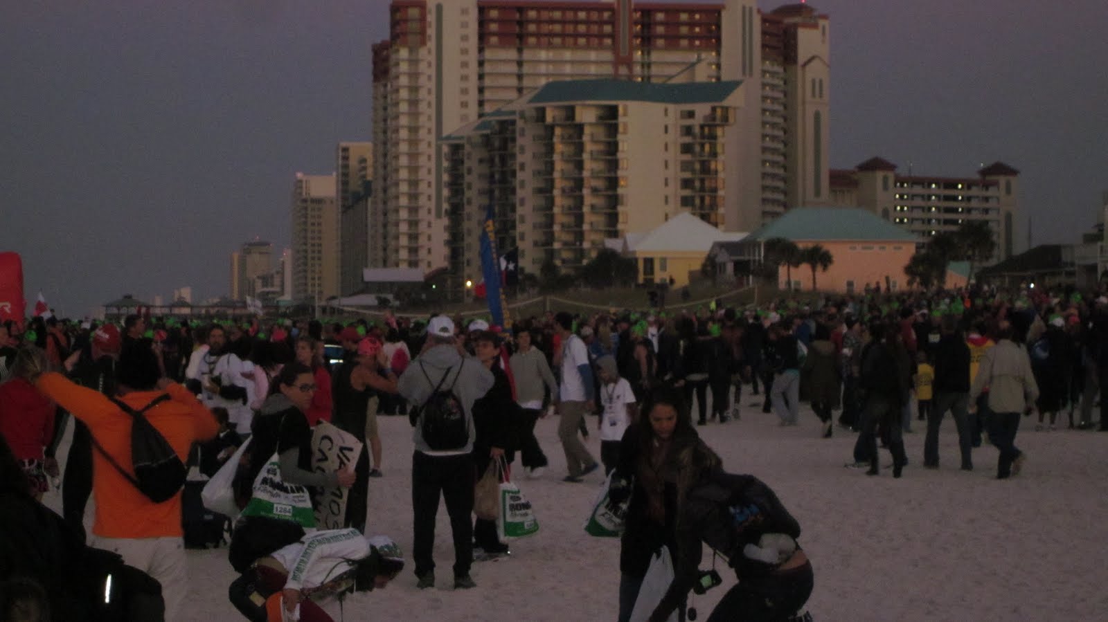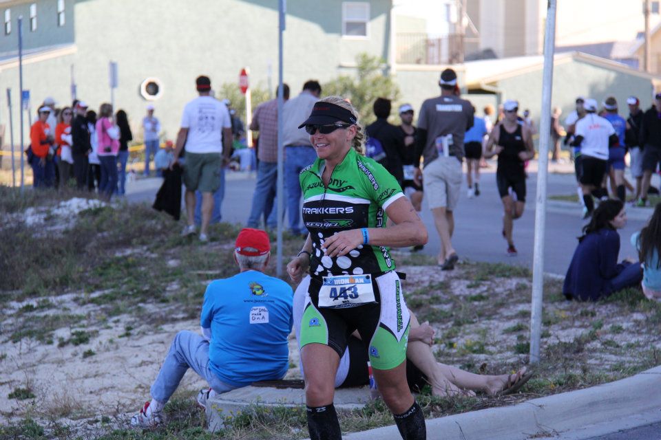 Second loop was uneventful – more jellyfish, same temperature change, same thing with athletes cutting the last buoy (come on guys, you know you have to go to the RED buoy before you make the turn!!), but no drafter on this loop. Yay. As I get to the end, I hear more cheers and try to muster a smile as I ran across the mat. I ran under the showers, splashed some fresh water on my face and ran to T1. The calves DO NOT LIKE running in sand, but thankfully, that pulling sensation went away as soon as I hit solid ground.